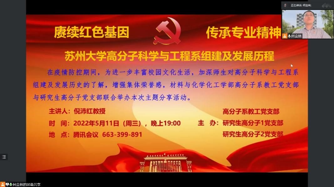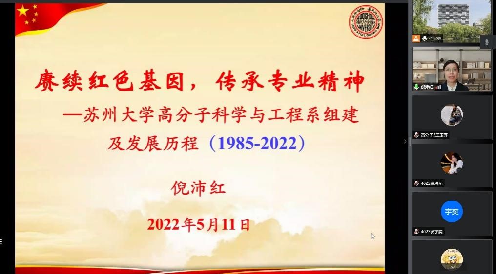 时代各有不同,青春一脉相承。在疫情防控期间,为进一步丰富校园文化生活,加深师生对苏州大学高分子科学与工程系的了解,增强集体荣誉感,5月11日晚,材料与化学化工学部高分子系教工支部联合研究生高分子1党支部、2党支部,举办了“赓续红色基因,传承专业精神”的主题党日活动,邀请有着35年党龄的倪沛红同志分享高分子系的组建及发展历程,材化部主任张正彪出席活动。